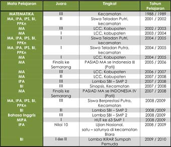 Prestasi Akademis yang pernah di raih SD Kartini Blora hingga tahun 2010 |